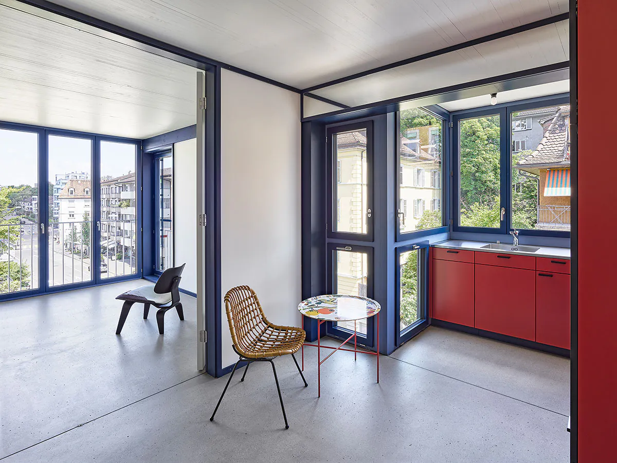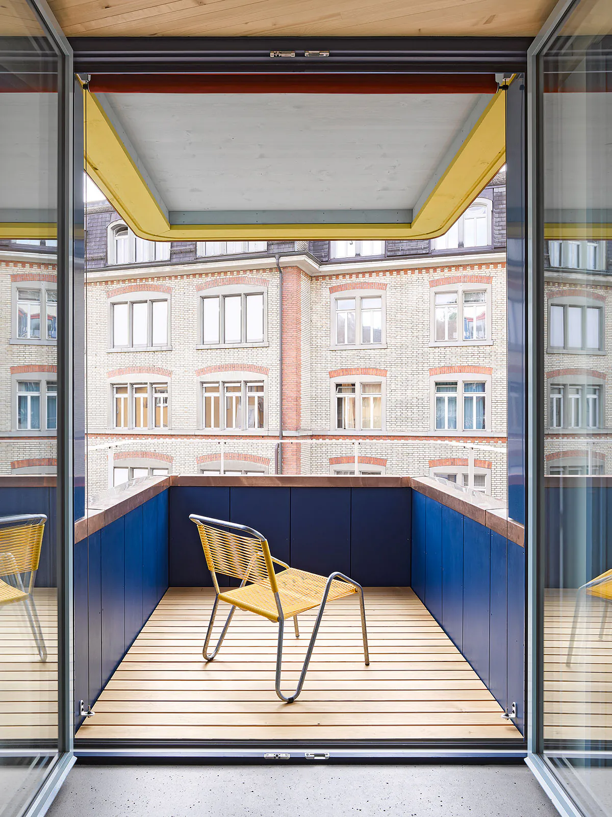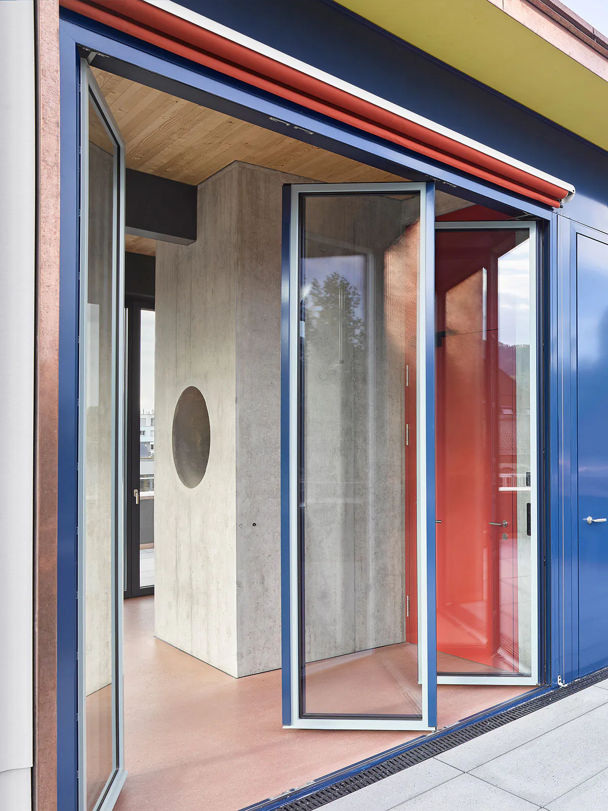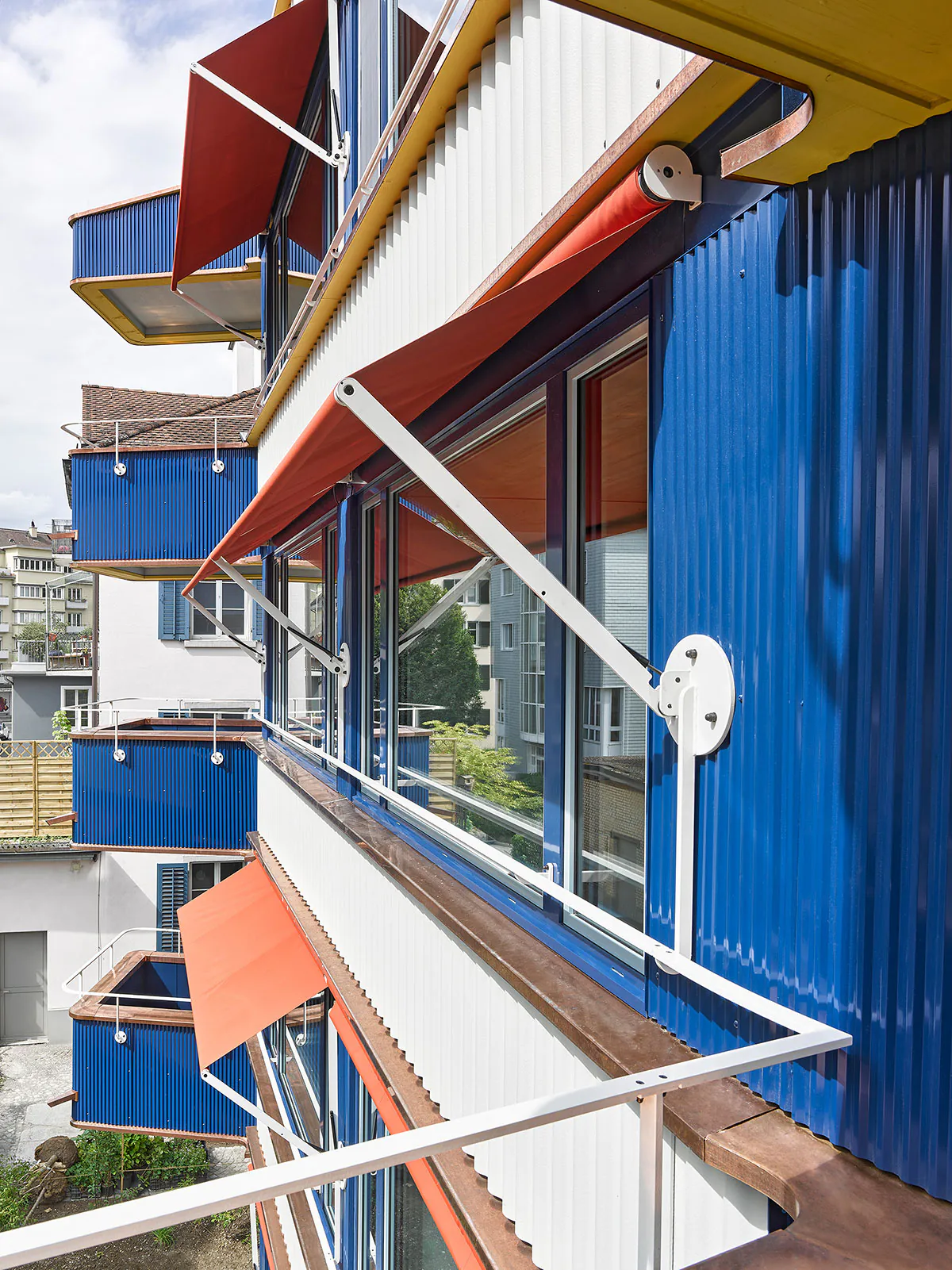 « façade » « métal « bleu » « blan » « jaune » « cuisine » « interieur » « cage Escalier » « béton » « dalle bois »