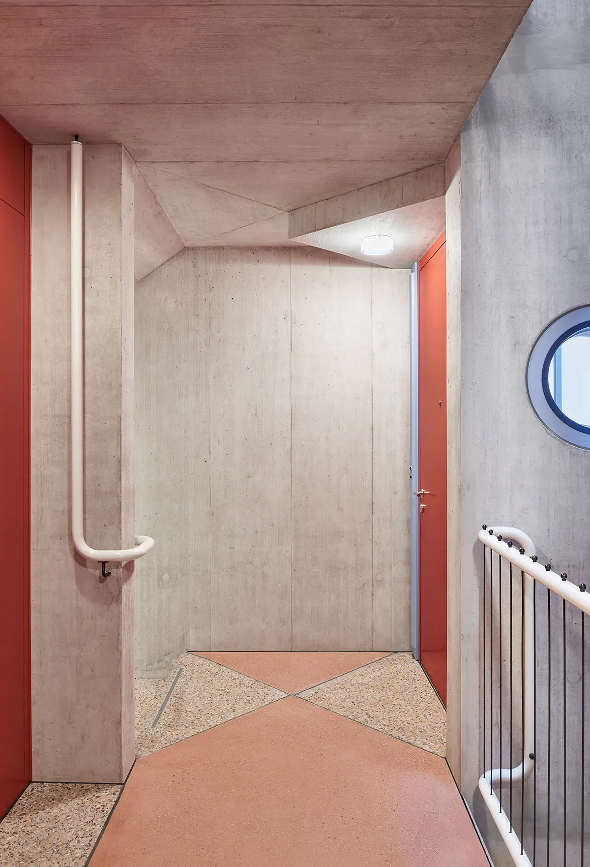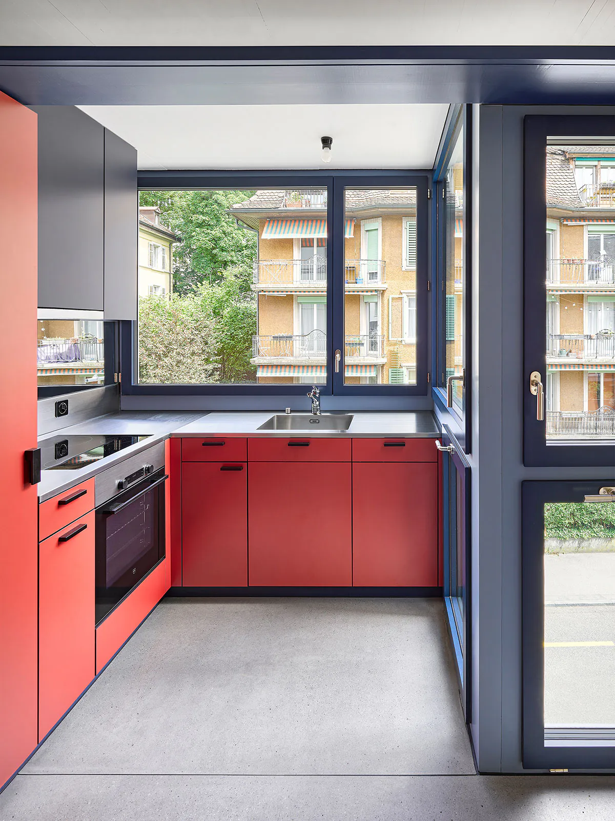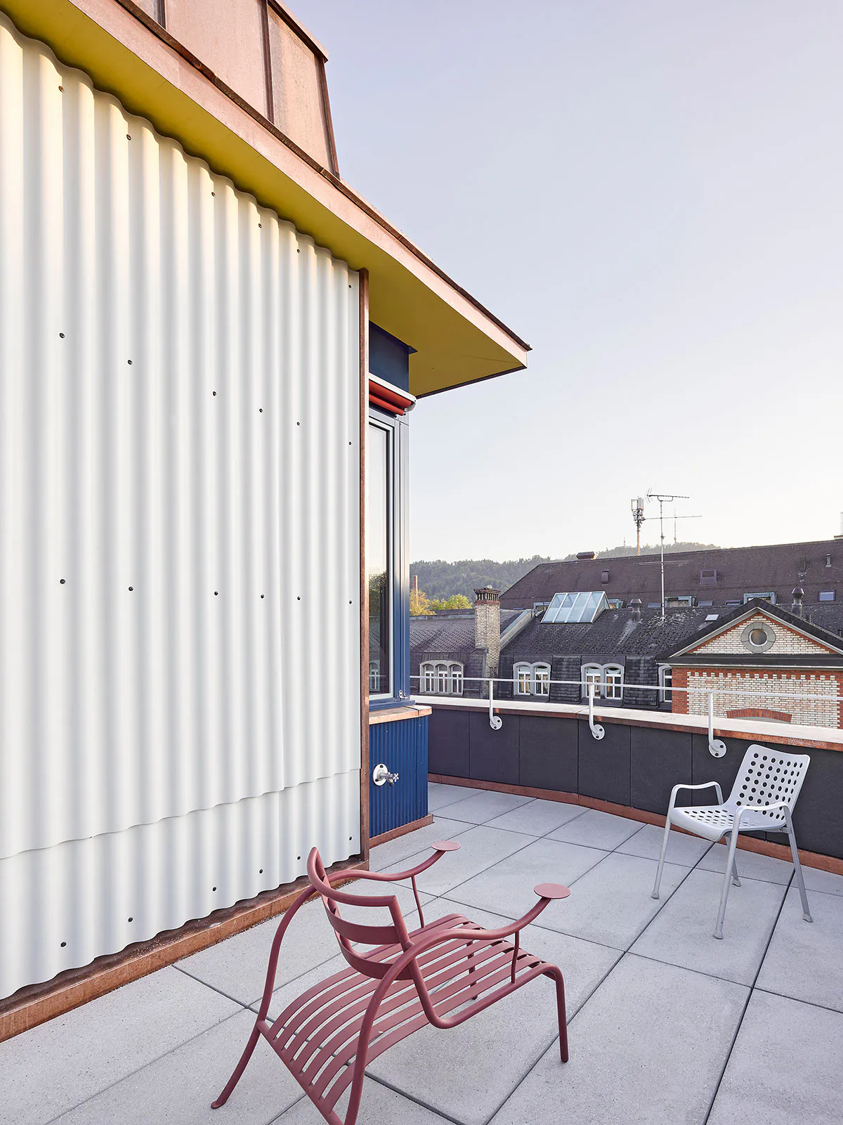 « façade » « métal « bleu » « blan » « jaune » « cuisine » « interieur » « cage Escalier » « béton » « dalle bois »