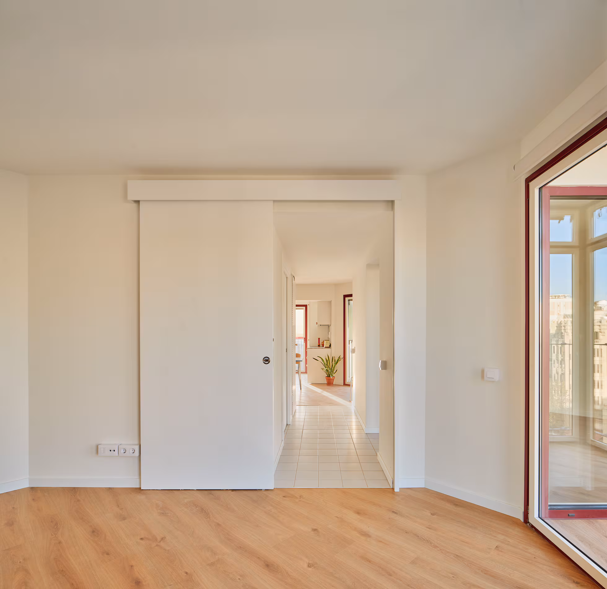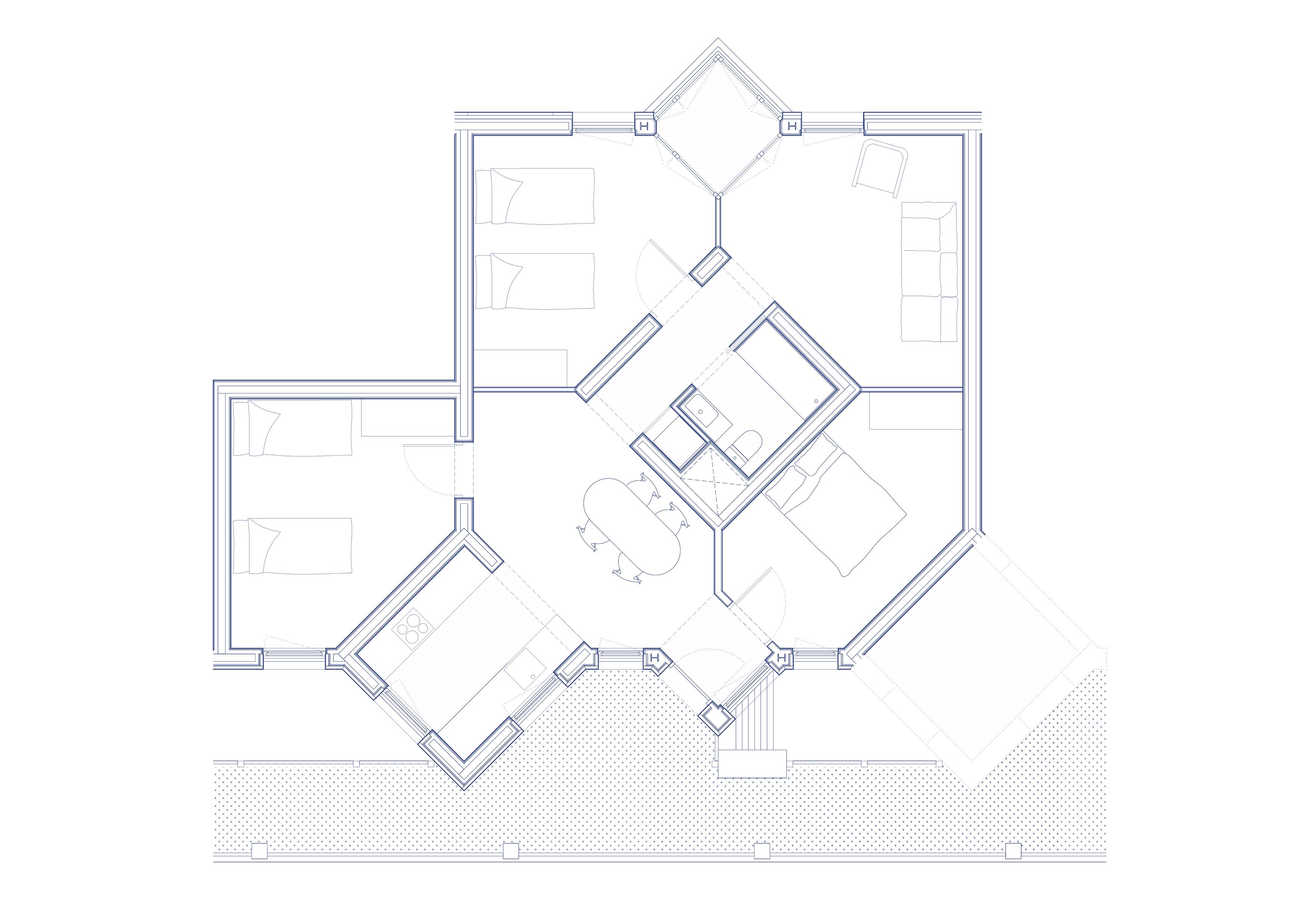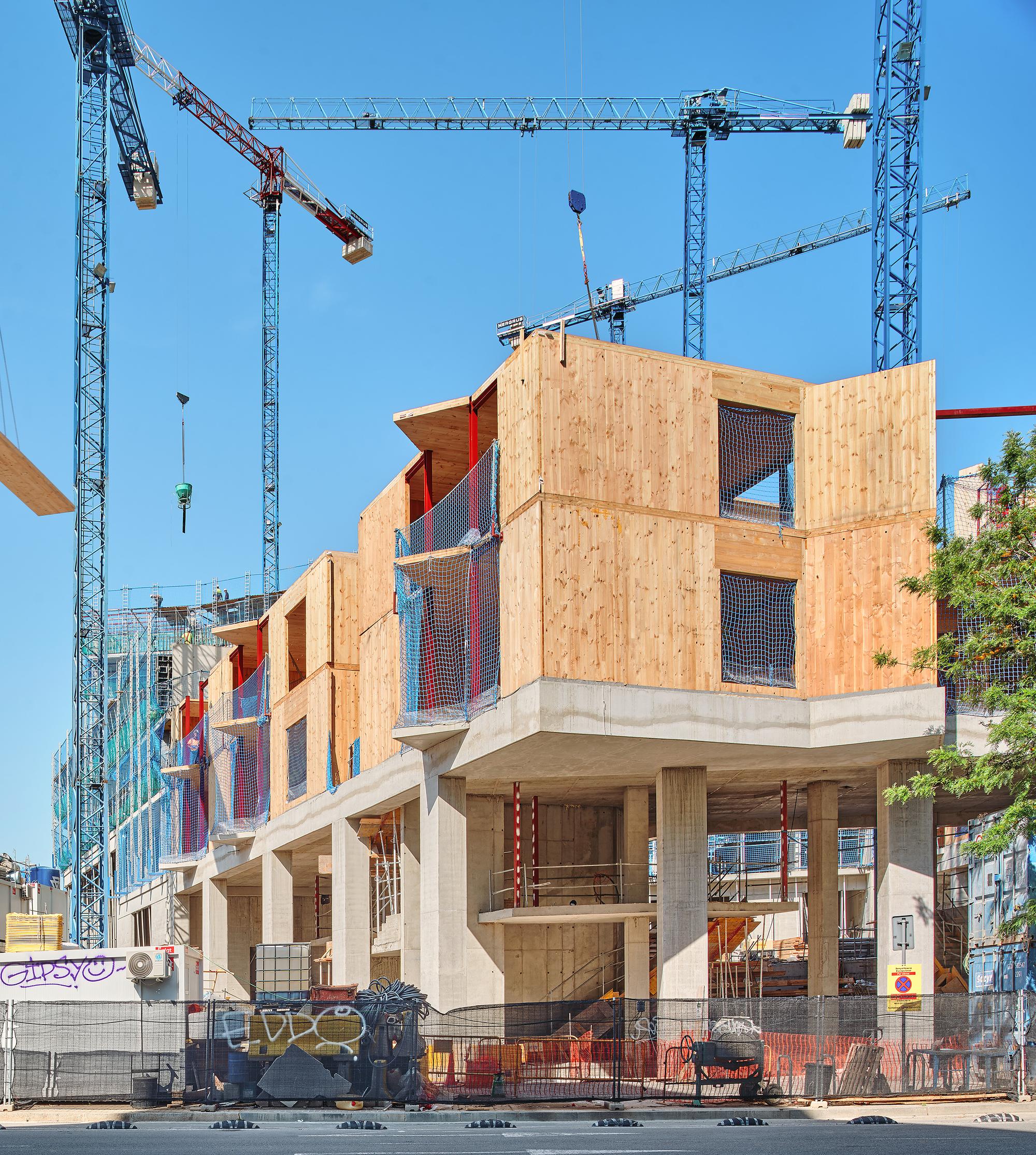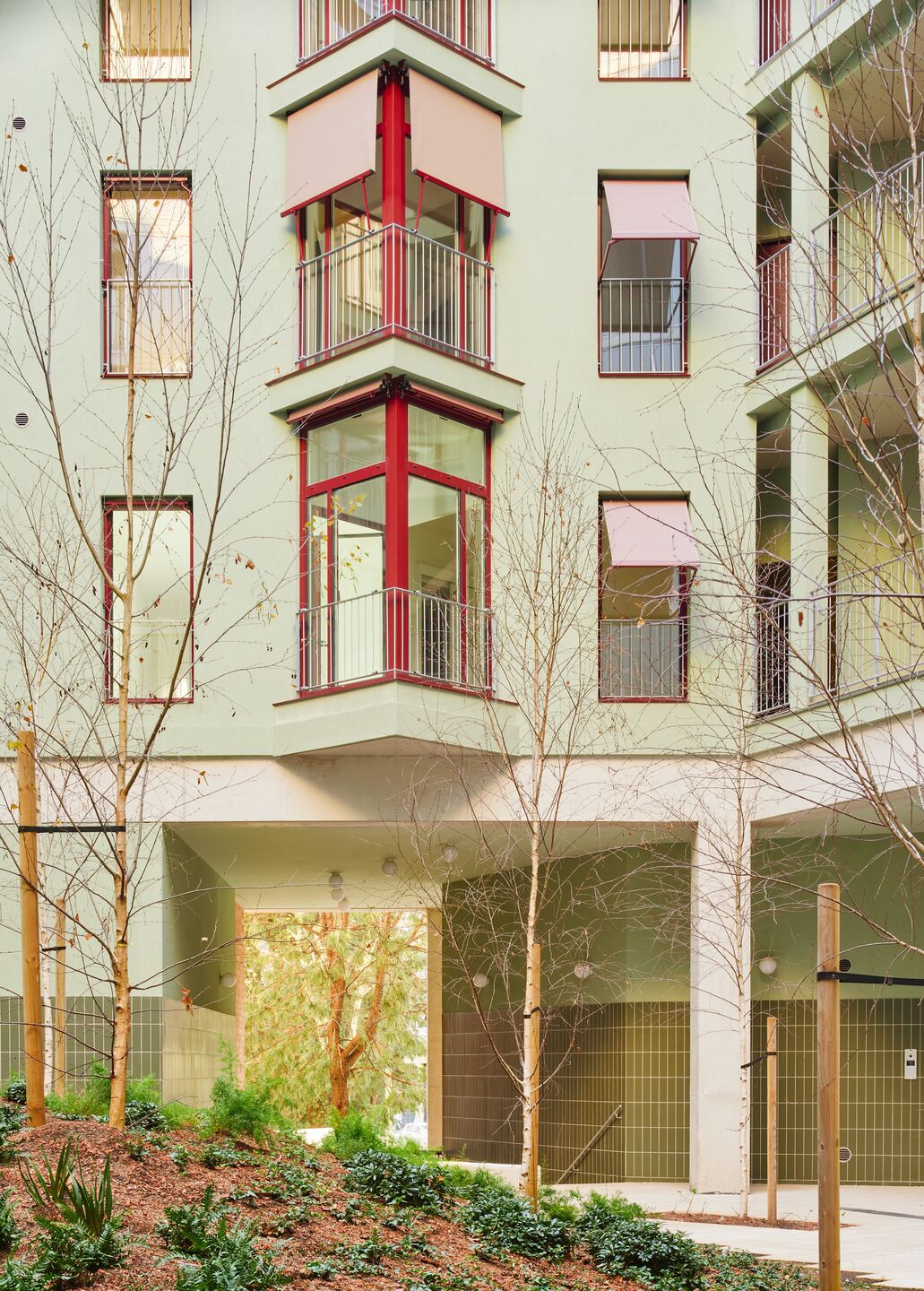 « façade » « crépis » « vert » « stores » « Rouge » « plan » « cuisine » « coursive » « poteaux » « béton » « structure » « Bois »